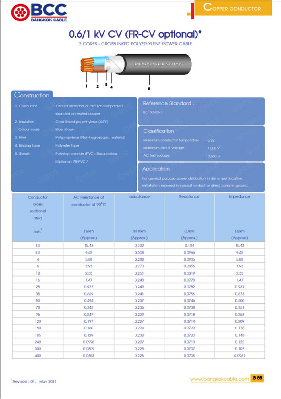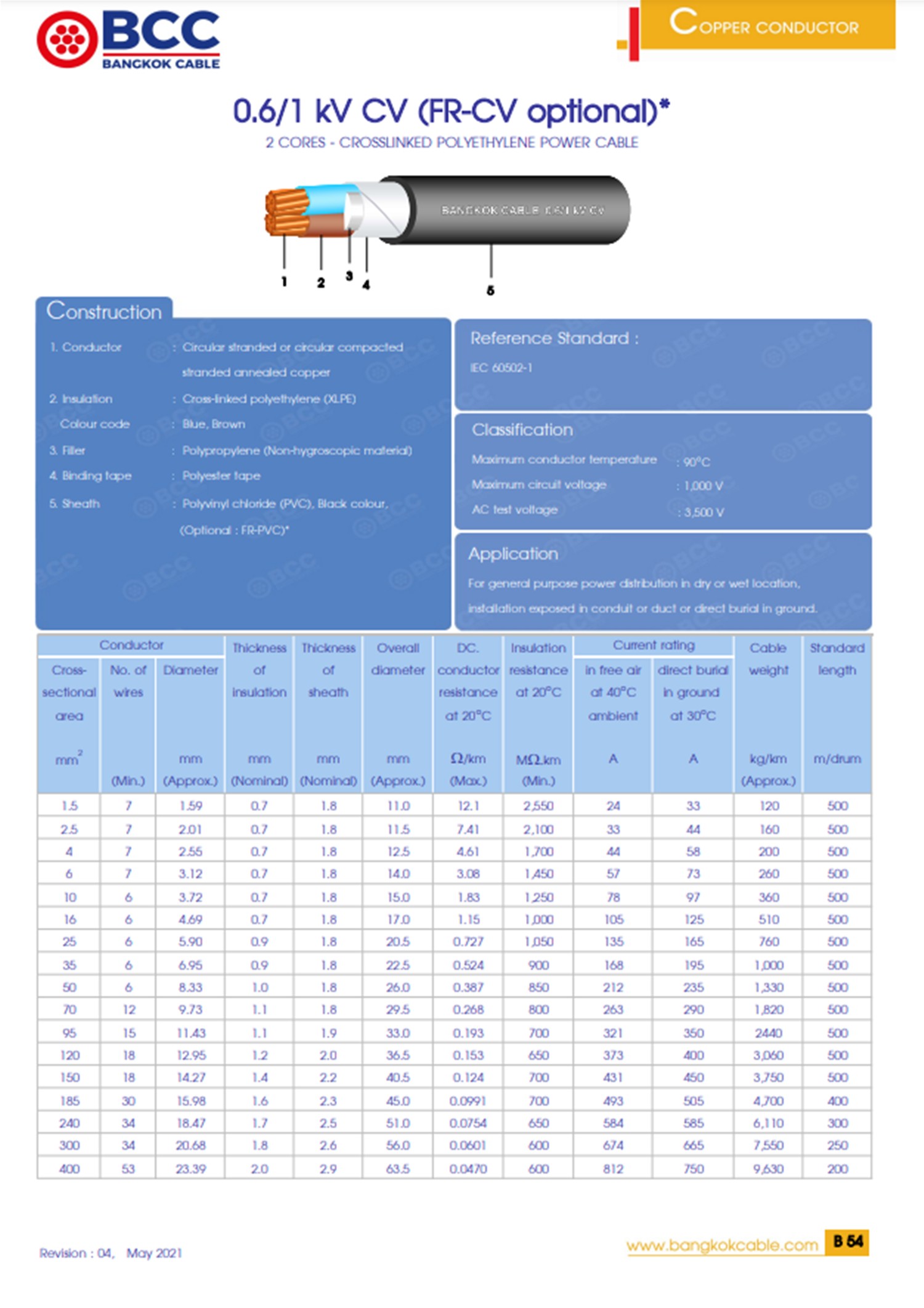 BANGKOK CABLE XLPE/PVC 0.6/1 kV 90°C CV 2 Core